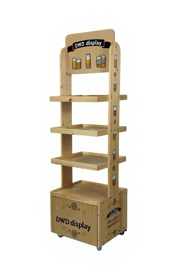 Beverages Boost your in-store merchandising with this natural wood floor display rack, designed specifically for bottled drinks, canned beverages, or promotional items. Ideal for supermarkets, convenience stores, and craft beverage retailers.