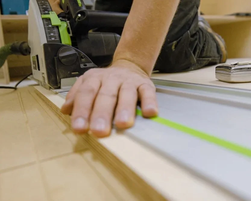 Close-up of a person's hand pressing a green line on a cutting guide attached to a piece of wood, with a power saw in the background.